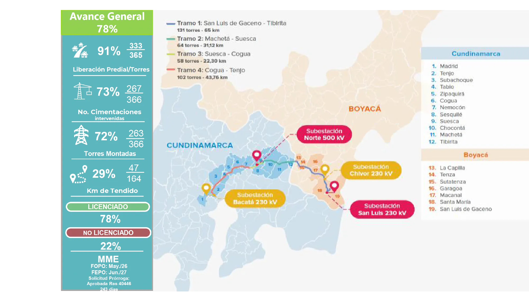 FOPO: Fecha Oficial de Puesta en Operación FEPO: Fecha Estimada de Puesta en Operación Mod.L.A : Modificación de licencia Ambiental ST: Sitios de Torre Sus: Sustracción Reserva MADS: Ministerio de Ambiente y Desarrollo Sostenible ANLA : Autoridad Nacional de Licencias Ambientales PT: Plaza de Tendido SE NE. Subestación Norte