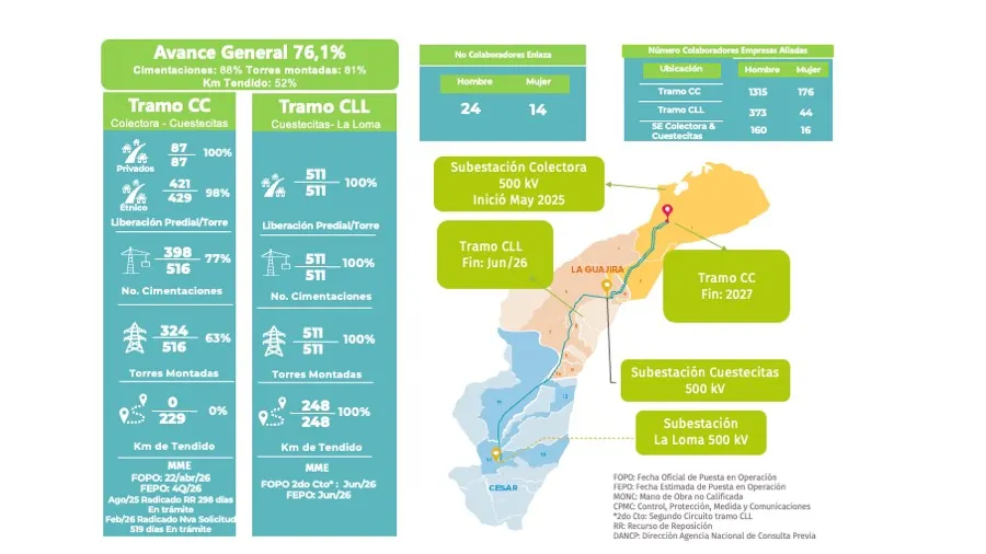 El proyecto Colectora conectará 7 parques eólicos localizados en La Guajira al Sistema Interconectado Nacional (SIN) con una capacidad de 1050 MW.