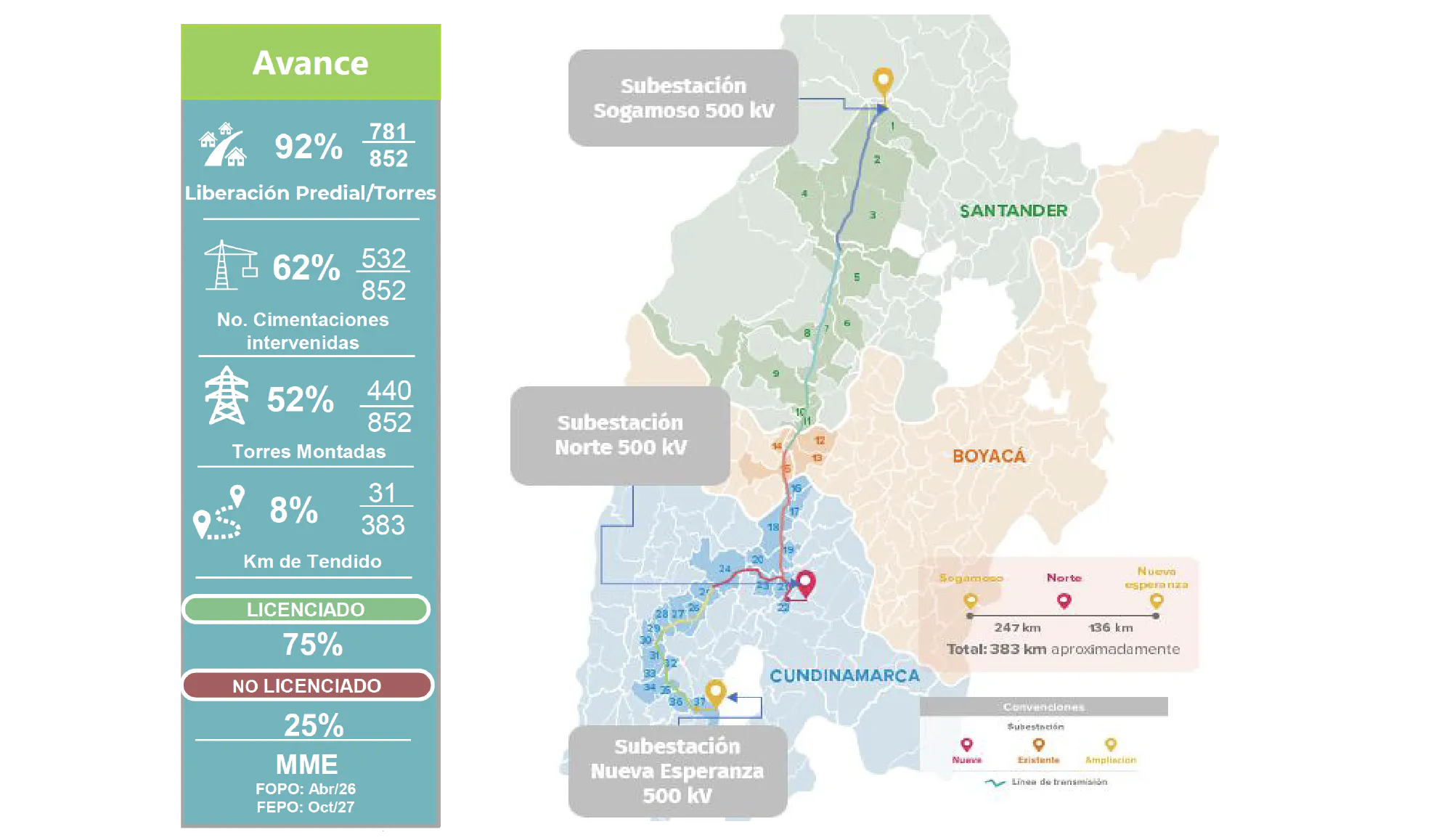 Informe de avance del proyecto de transmisión eléctrica Sogamoso 500 kV. Accede a los porcentajes de progreso en liberación predial, cimentaciones, y estado de las licencias ambientales (MLA), trámites y subestaciones.